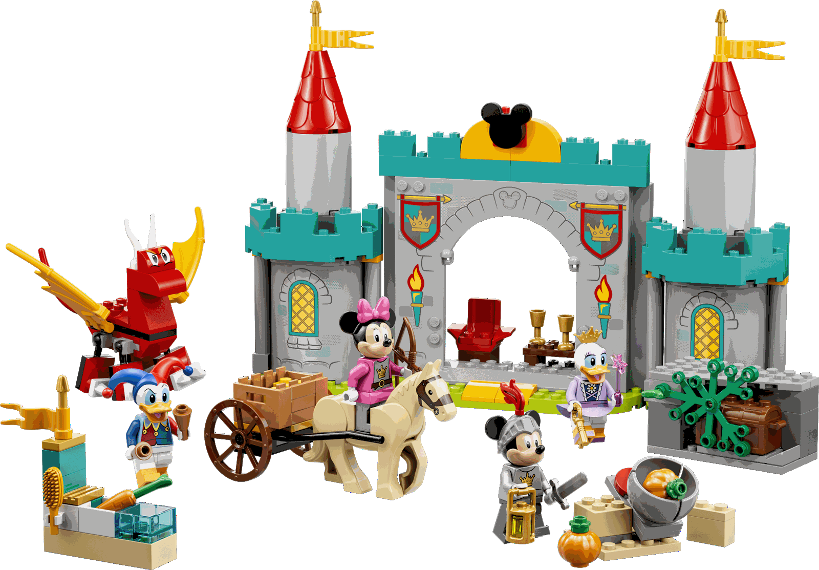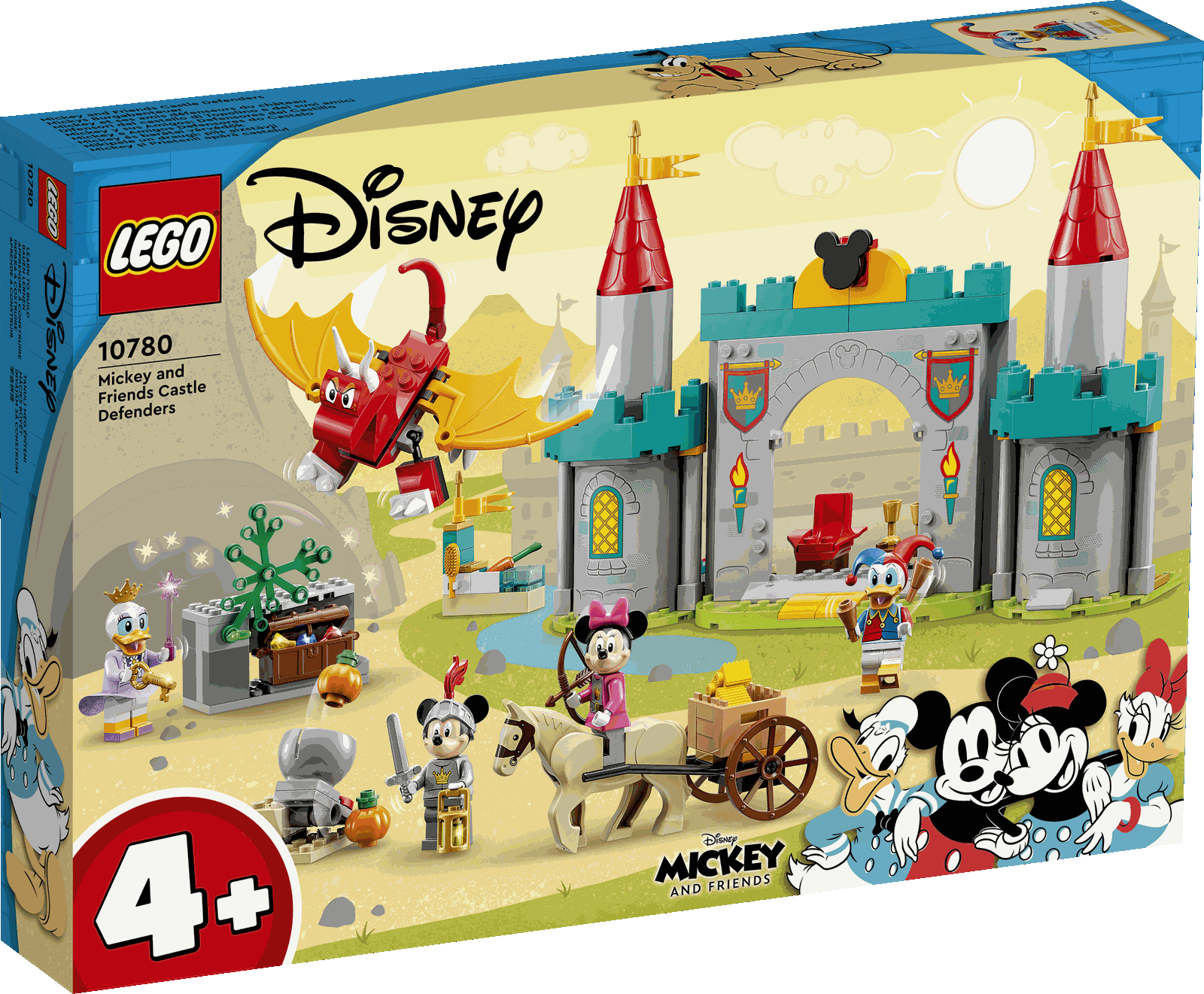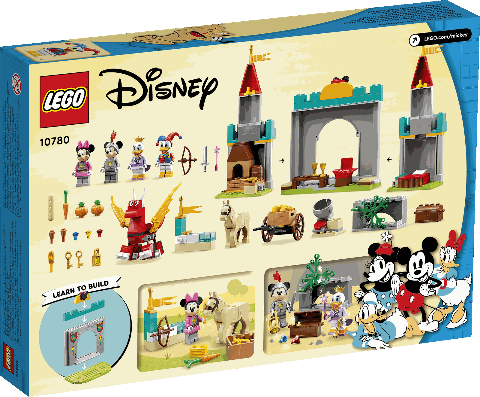 Das LEGO® Disney Mickey and Friends Set Mickys Burgabenteuer (10780) beinhaltet eine Burg mit Türmen, 4 kleine Modelle, die Minifiguren Micky Maus, Minnie Maus, Daisy Duck und Donald Duck, einen baubaren Drachen und ein LEGO Reitpferd. Zum ersten Mal tragen alle Minifiguren Fantasy-Kostüme. Mit diesem Set können Kinder ab 4 Jahren spannende Abenteuer als Rollenspiele darstellen und dabei Kommunikationsfähigkeiten entwickeln.