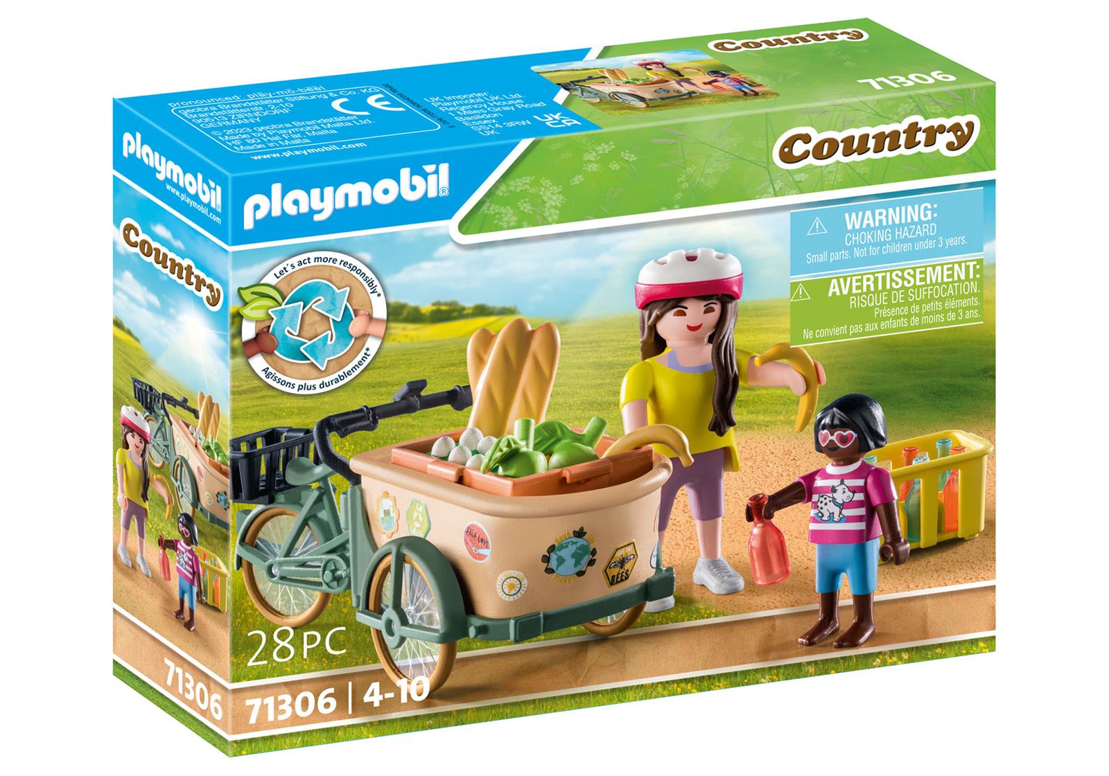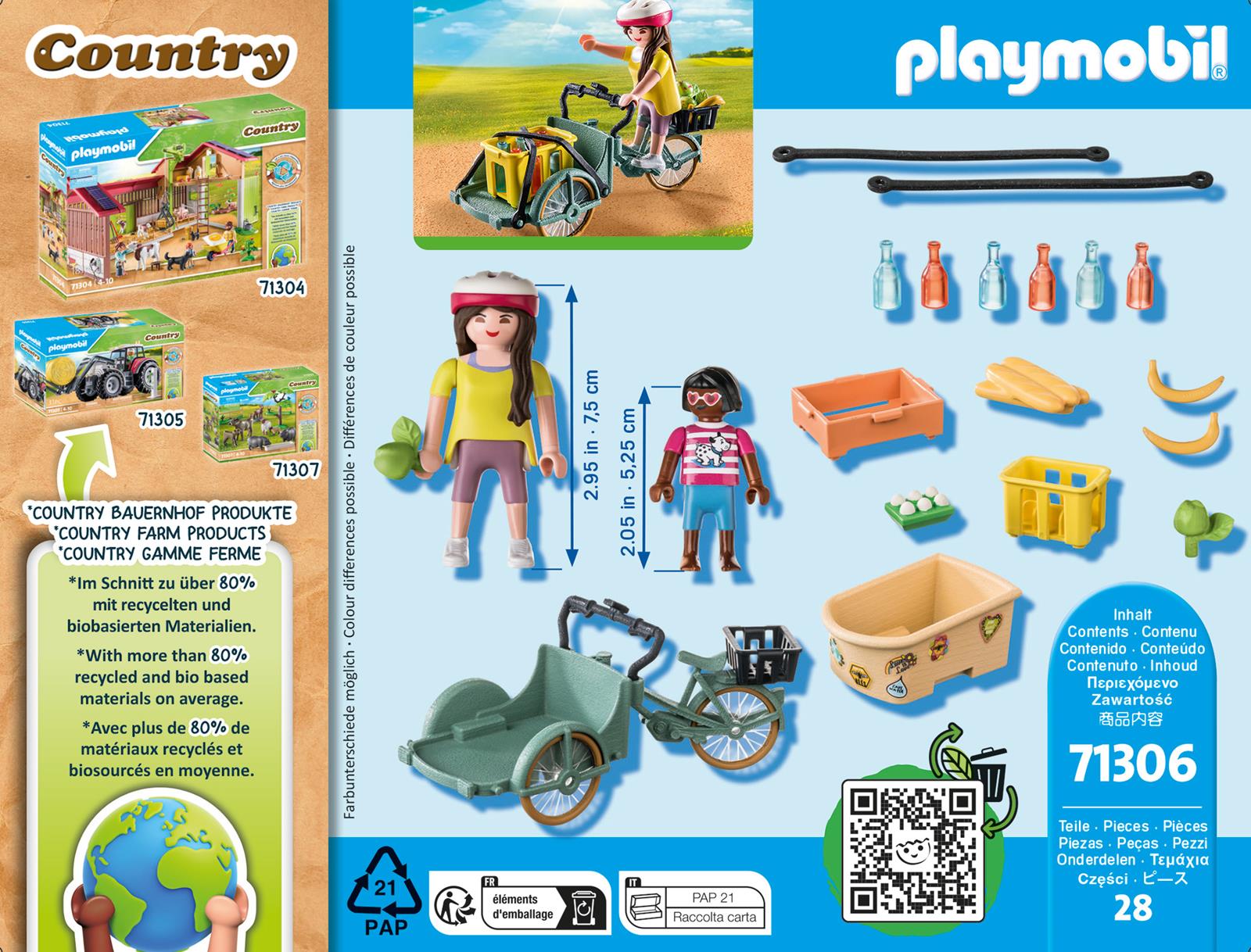 Nutze das praktische Lastenfahrrad, um deine Einkäufe bequem und umweltschonend zu transportieren. Auf der vorderen Ladefläche finden sowohl die Getränkekiste als auch Lebensmittel Platz. Für einen sicheren Transport werden die Gegenstände mit den beiden Silikongurten befestigt. Aber das Lastenfahrrad eignet sich nicht nur für Einkäufe, in die große Transportschale passt auch eine Kinderfigur und kann gemütlich zum Kindergarten oder auf den Bauernhof gefahren werden. Mit den bunten Stickern kann die Transportschale kreativ dekoriert werden. Das 28-teilige Spielfigurenset enthält zwei PLAYMOBIL-Figuren, ein Lastenfahrrad mit austauschbarer Transportschale, eine Gemüsebox, eine Getränkekiste mit Flaschen und weitere Extras.