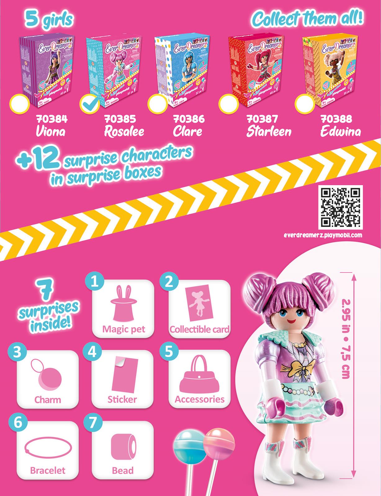 Willkommen in der Welt der Träume - willkommen im Reich der EverDreamerz! Rosalee, Viona, Edwina, Clare und Starleen, das sind fünf Freundinnen mit großen Träumen. Als die Mädchen ein magisches Amulett finden, öffnet sich ein Portal in ein anderes Universum, das Land ihrer Träume. Zuerst reisen die fünf in Rosalees Traumwelt, in der sich alles um Süßigkeiten dreht, denn Rosalee liebt Süßes über alles. Solange sie selbst Bonbons essen darf, teilt sie auch immer gerne selbstlos mit ihren Freundinnen. Doch nicht nur Bonbons haben es dem quirligen Mädchen angetan auch Marshmallows, Cupcakes und Schokolade nascht sie nur zu gerne. Neben ihren Freundinnen, wird Rosalee von ihrem geliebten Flamingo begleitet und hat natürlich auch eine Tasche zum Aufbewahren ihrer Zuckerschätze dabei. Rosalees einzige Angst ist der Zahnarzt, doch ihre Freundinnen helfen ihr diese zu überwinden. Das Spielset enthält EverDreamerz-Charakter Rosalee mit ihrem Flamingo und vielen zuckersüßen Accessoires in einer neuartigen Aufklappbox. Als speziellen Charmanhänger hat Rosalee ein Bonbon. Toller Sammeleffekt: Jeder EverDreamerz-Charakter hat ein eigenes Silikonarmband für Kinder mit individuellem Charakteranhänger zum Sammeln und Tauschen. Die Figur und ihre Accessoires können in der bunten Packung aufbewahrt und mitgenommen werden.