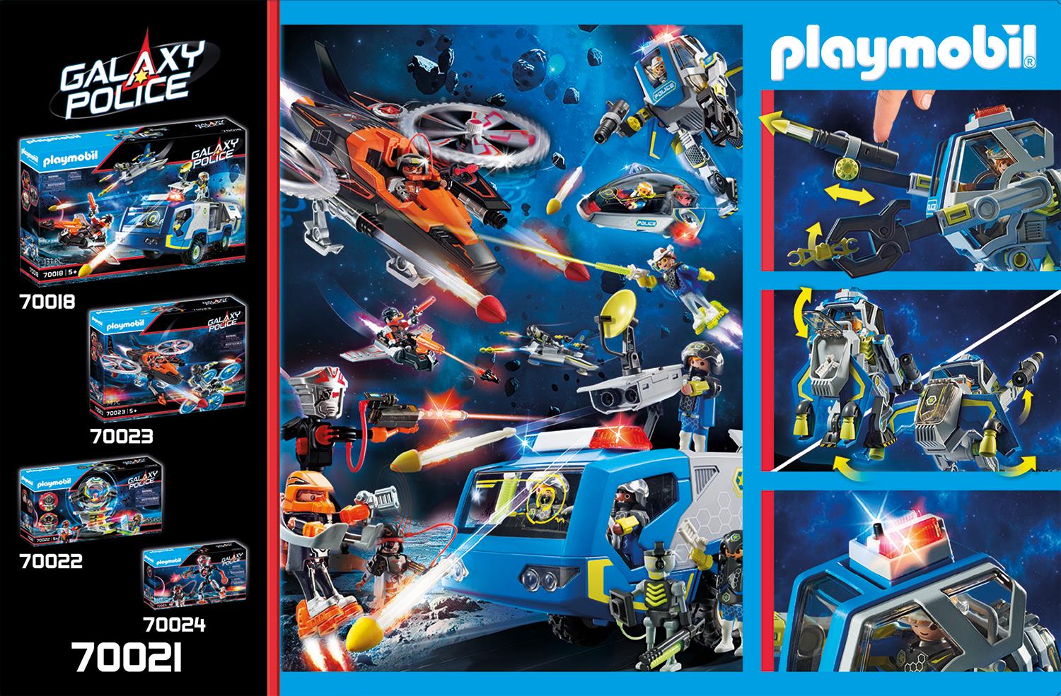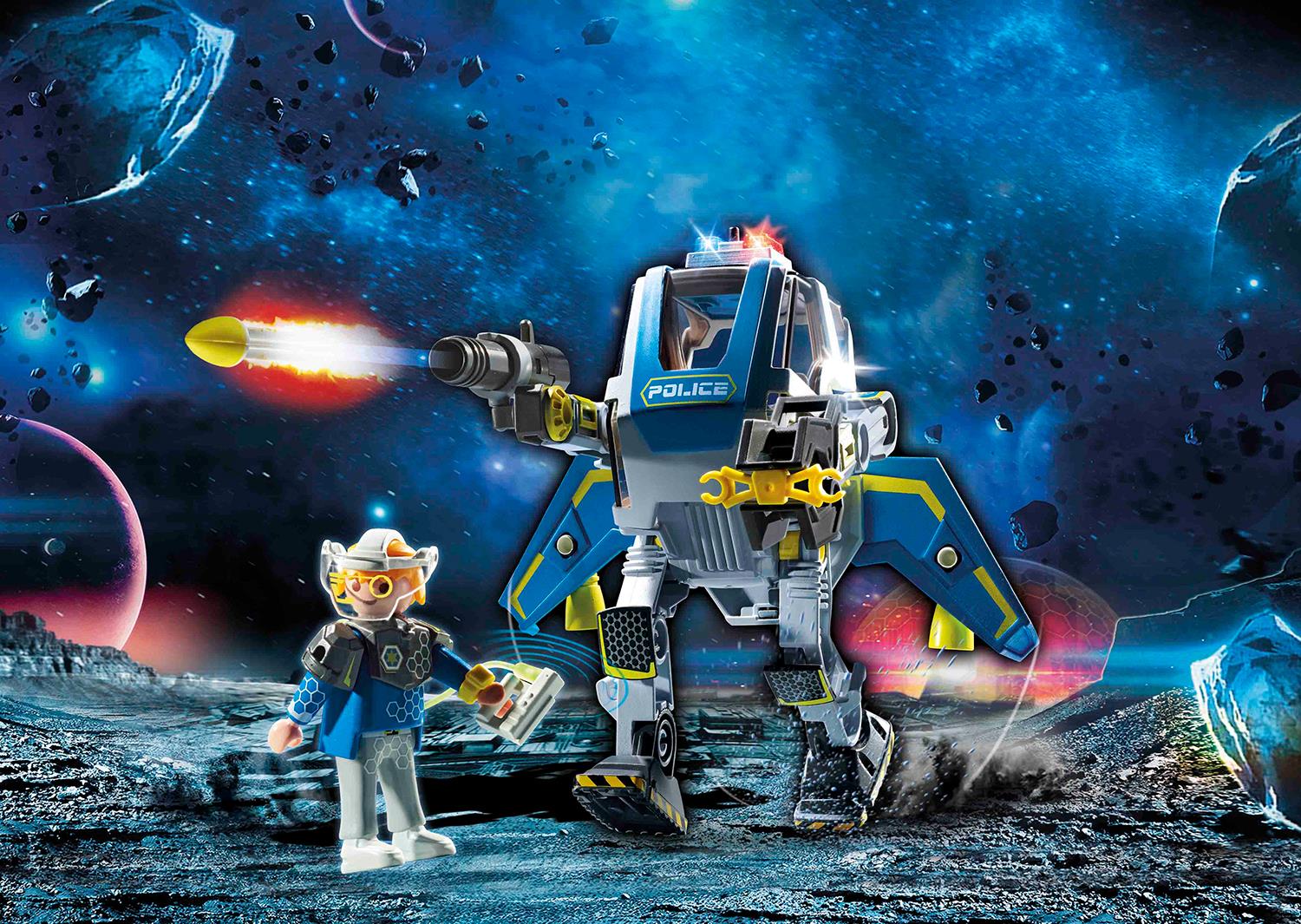 Mit ihrem gelenkigen Galaxy Police Roboter nehmen die Space Polizisten die Verfolgung der Piraten auf. Schnell die Kabine aufklappen und einsteigen, dann das Blinklicht einschalten und los geht´s! Durch seine langen, beweglichen Beine ist der Roboter schon sehr schnell, aber wenn er den Bösewicht dennoch nicht einholt, klappt er einfach die Flügel seines Jet-Packs auf und hebt ab in die Lüfte. Ist der Flüchtige gefassst, werden ihm gleich die Handschellen angelegt. Das Spielset besteht aus einer PLAYMOBIL-Figur, einem Police-Roboter mit beweglichen Armen und Beinen, Jet-Pack mit ausklappbaren Flügeln und Stauraumfach, sowie einem Blinklicht, Brustpanzer, Schulteraufsätzen, Handschellen und vielen weiteren Extras.