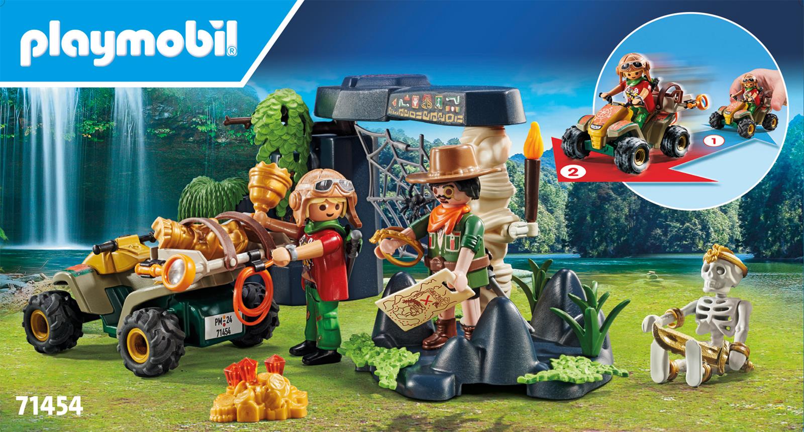 Auf ihrer Schatzsuche stoßen die Abenteurerin und der Abenteurer auf eine Ruine, deren Eingang von einem Skelett bewacht wird. Die geborgenen Schätze transportieren sie samt zahlreichem Equipment in ihrem Quad mit Rückzugsmotor.