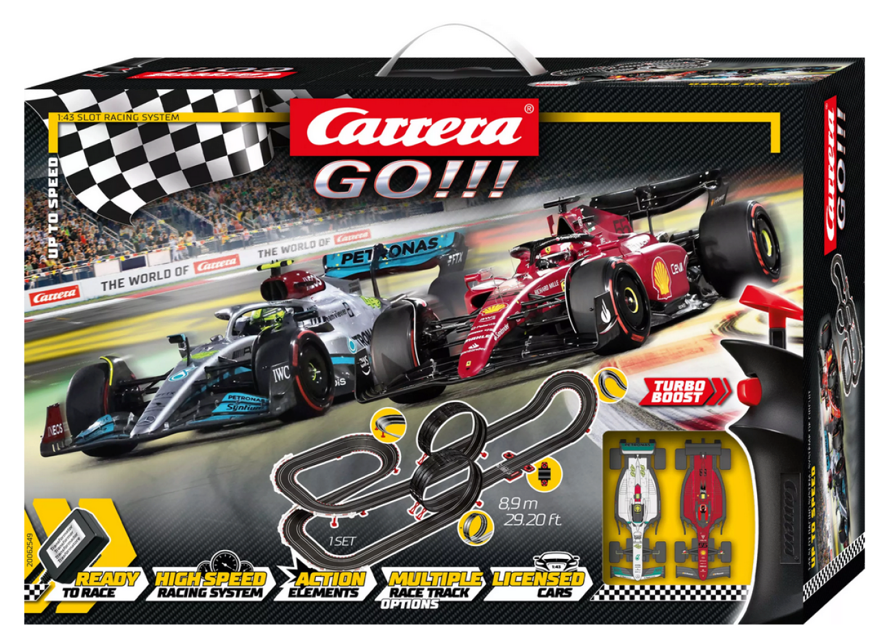 Carrera GO!!! bietet mit dem Set Up To Speed" pure Formel-1-Action auf 8,9 Metern Rennstrecke. In diesem Set flitzen du und deine Freunde mit den original 2022 Formel-1-Boliden über die Rennbahn. Rekordweltmeister Lewis Hamilton tritt in diesem Set im direkten Duell gegen Ferrari-Star Carlos Sainz an.