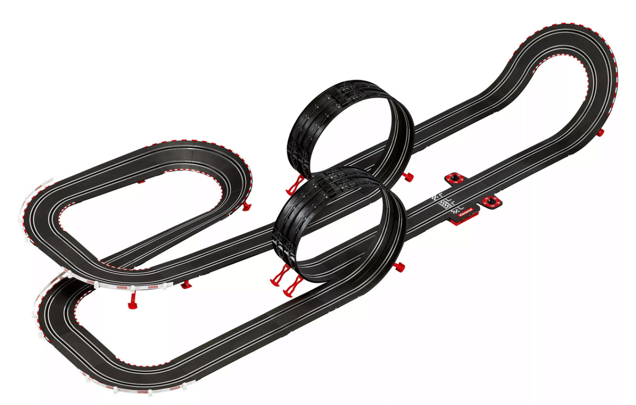 Gesteuert durch die Handregler flitzen der Mercedes-AMG F1 W13 E Performance Hamilton, No.44" und der Ferrari F1-75 Sainz, No.55" über lange Geraden, Kurven, Steilkurven über das Fly-Over und entlang zweier Loopings. Actiongeladener Fahrspaß ist vor allem durch den Turbo-Botton am Handregler garantiert.