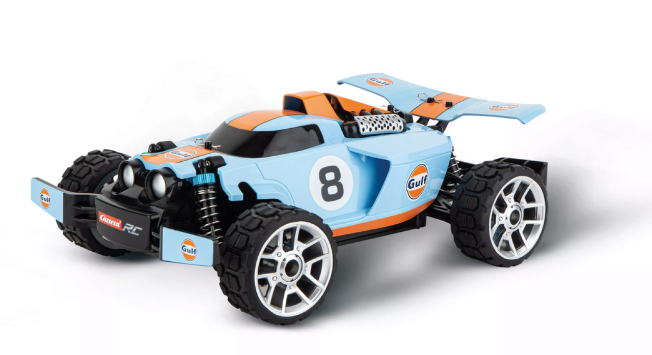 In der Lackierung des bekannten Gulf-Rennstalls startet der Carrera Profi RC Gulf Motorsport Buggy in spannende Rennen. Das ikonische Design in hellem blau mit dem orangen Streifen kennen Rennfans aller Altersklassen bereits und als Buggy von Carrera Profi RC macht das Design einiges her.