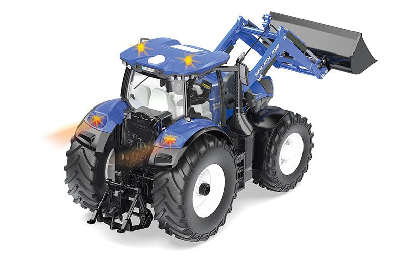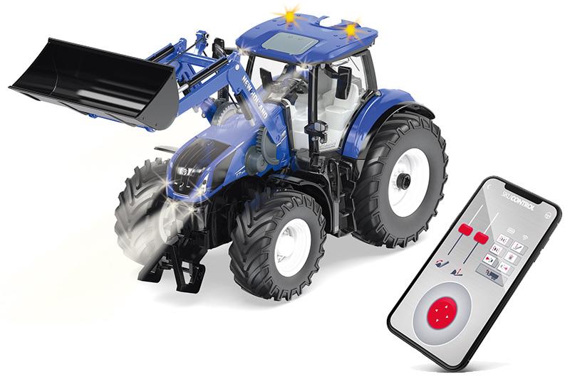 6,7-Liter-Sechszylinder, 313 PS: Der New Holland T7.315 ist das Spitzenmodell der Heavy Duty-Baureihe. Der kraftvolle und zugleich sparsame Motor macht den Großtraktor zu einem Allrounder auf dem Acker und der Straße. Mit dem Frontlader wird der New Holland T7.315 zum Arbeitsgerät auf dem Hof. Mit der SIKUCONTROL APP lassen sich mit Smartphone und Tablet die 5 Getriebe, die 12 LEDs und die zahlreichen Funktionen des Traktors wie die Heckkupplung steuern. Der Heckantrieb und die Lenkung sind proportional gesteuert. Zudem können der Ladearm des Frontladers und der Lader wirklichkeitsnah bewegt werden. Der Ladearm kann auch mit einer Palettengabel bestückt werden. Damit wird der Frontlader zu einem Gabelstapler. Die Gabel wird auch bei Hubbewegungen automatisch in der Waagerechten gehalten. Die Funktionen können wahlweise über die virtuelle Gamepad-Steuerung oder die Bewegungssensoren der mobilen Geräte gesteuert werden. Dieses intuitive Feature bietet zusätzlichen Spielspaß. Die SIKUCONTROL APP steht kostenlos zum Download im App Store und im Google Play Store bereit. Die Einstellungen und Funktionen der App werden laufend aktualisiert. Mit der OTA (Over-The-Air)-Funktion der App kann auch die Software des Traktors direkt aktualisiert werden.
