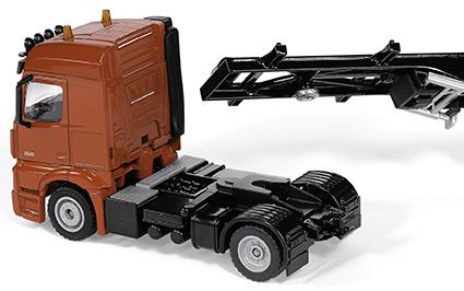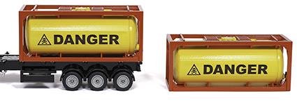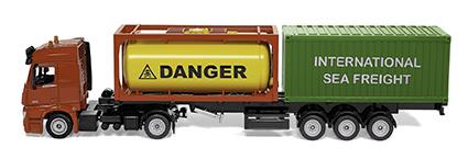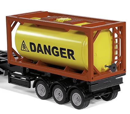 Flüssige Grundstoffe und Gase werden weltweit gehandelt, verarbeitet und in Tankcontainern transportiert. Auf dem Frachter, auf der Schiene oder eben auf der Straße. Dort übernimmt der neue SIKU SUPER50 Mercedes-Benz Arocs mit einem dreiachsigen Sattelauflieger den Transport. Der Container ist in einem Rahmen gefasst und kann wie das Original abgeladen und gestapelt werden. Die Klappen der Befüllstutzen lassen sich öffnen und der Tank mit Wasser füllen. Der Rahmen des Sattelaufliegers ist verlängerbar, dann können zwei Container transportiert werden. Und auch die Zugmaschine begeistert mit einer Funktion. Das Führerhaus lässt sich nach vorne kippen und gibt den Blick auf den leistungsstarken Dieselmotor frei. Natürlich lassen sich die Container des SIKU Lkw mit Container (3921) transportieren.