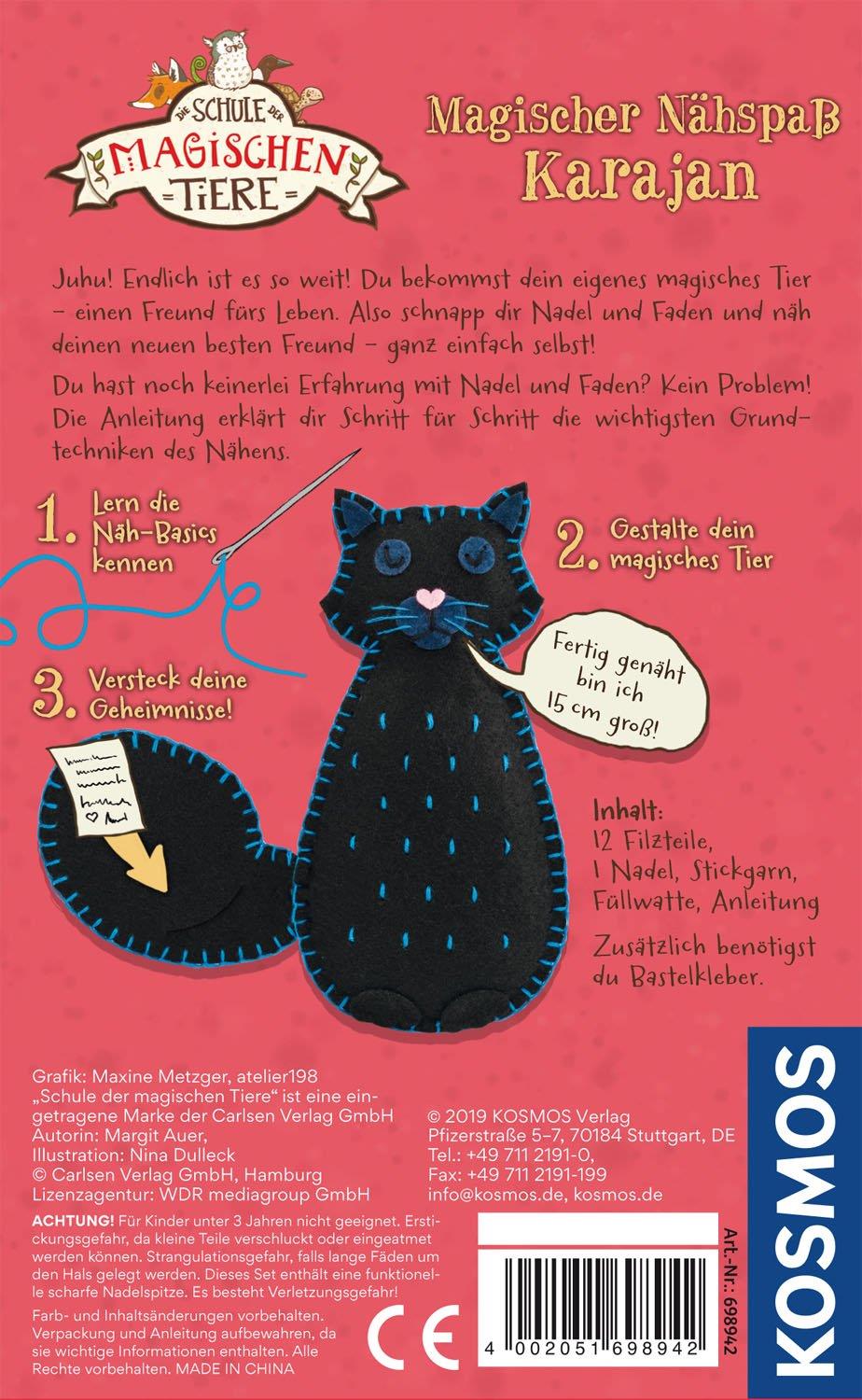 Hi, ich bin Karajan! Dein neuer Freund fürs Leben mit einem ganz besonderen Versteck für deine Geheimnisse und Wünsche. Jedes Kind kann sich mit Magischer Nähspaß Karajan seinen magischen Kater aus der Kinderbuchreihe Die Schule der magischen Tiere selbstnähen. Dank einer einfachen Anleitung, die Schritt für Schritt die Grundtechniken erklärt, ist das 15 Zentimeter große Filztier im Handumdrehen genäht. Filz, Garn, Nadel und Füllung sind natürlich enthalten. Das Besondere: Die kleine Tasche in seinem Schwanz macht Karajan zu einem vertrauensvollen Begleiter für jedes Kind.