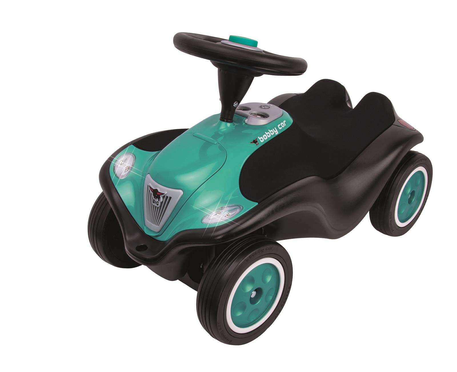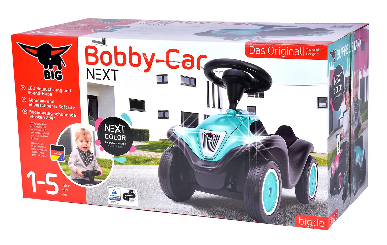 Ein ganz besonderes Rutschfahrzeug, dessen LED-Frontscheinwerfer durch einen Berührungssensor in der Tachoanzeige ganz leicht ein- und ausgeschaltet werden können. Hoher Sitzkomfort ist durch den abnehm- und abwischbaren Softsitz garantiert. Inklusive breiter Flüsterräder sowie einer zu öffnenden Motorhaube. Durch die Direktanlenkung der Achse besitzt das BIG-Bobby-Car Next einen besonders kleinen Wendekreis. Wie alle BIG-Bobby-Car ist das Next mit jeweils einer Anhängerkupplung vorne und hinten ausgestattet. Ein hochwertiges Lenkrad mit elektronischer Hupe und Anlasser rundet die Ausstattung ab. Für höchstmögliche Sicherheit bürgt das GS-Zeichen des TÜV-Rheinland.