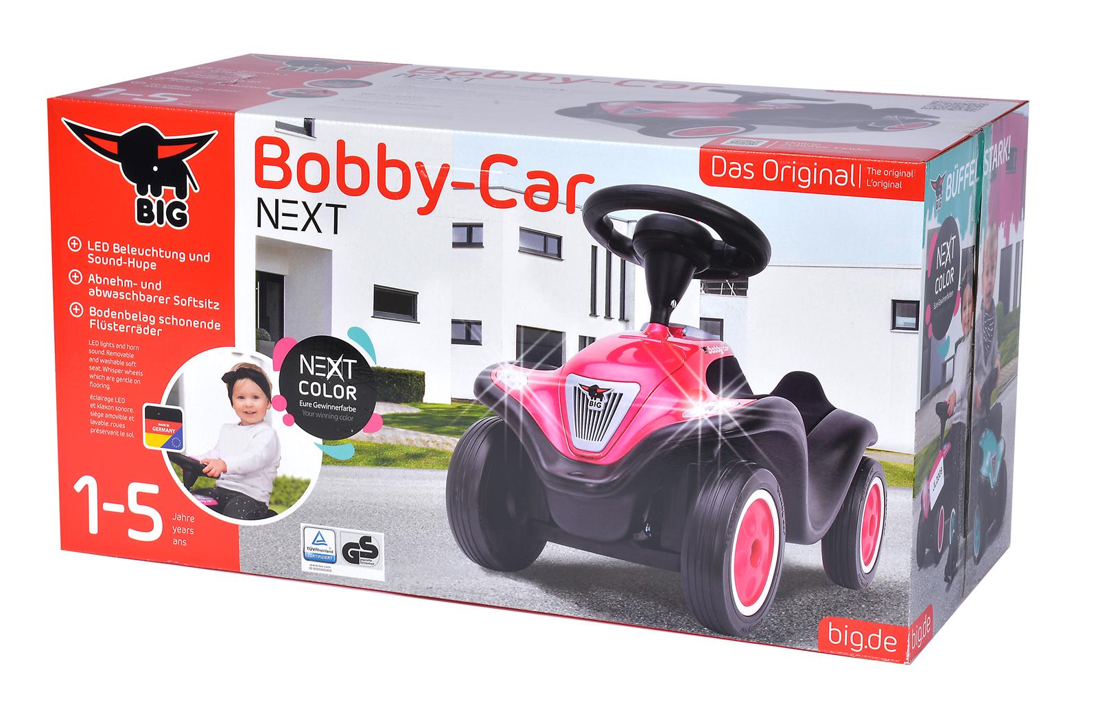 Ein ganz besonderes Rutschfahrzeug, dessen LED-Frontscheinwerfer durch einen Berührungssensor in der Tachoanzeige ganz leicht ein- und ausgeschaltet werden können. Hoher Sitzkomfort ist durch den abnehm- und abwischbaren Softsitz garantiert. Inklusive breiter Flüsterräder sowie einer zu öffnenden Motorhaube. Durch die Direktanlenkung der Achse besitzt das BIG-Bobby-Car Next einen besonders kleinen Wendekreis. Wie alle BIG-Bobby-Car ist das Next mit jeweils einer Anhängerkupplung vorne und hinten ausgestattet. Ein hochwertiges Lenkrad mit elektronischer Hupe und Anlasser rundet die Ausstattung ab.