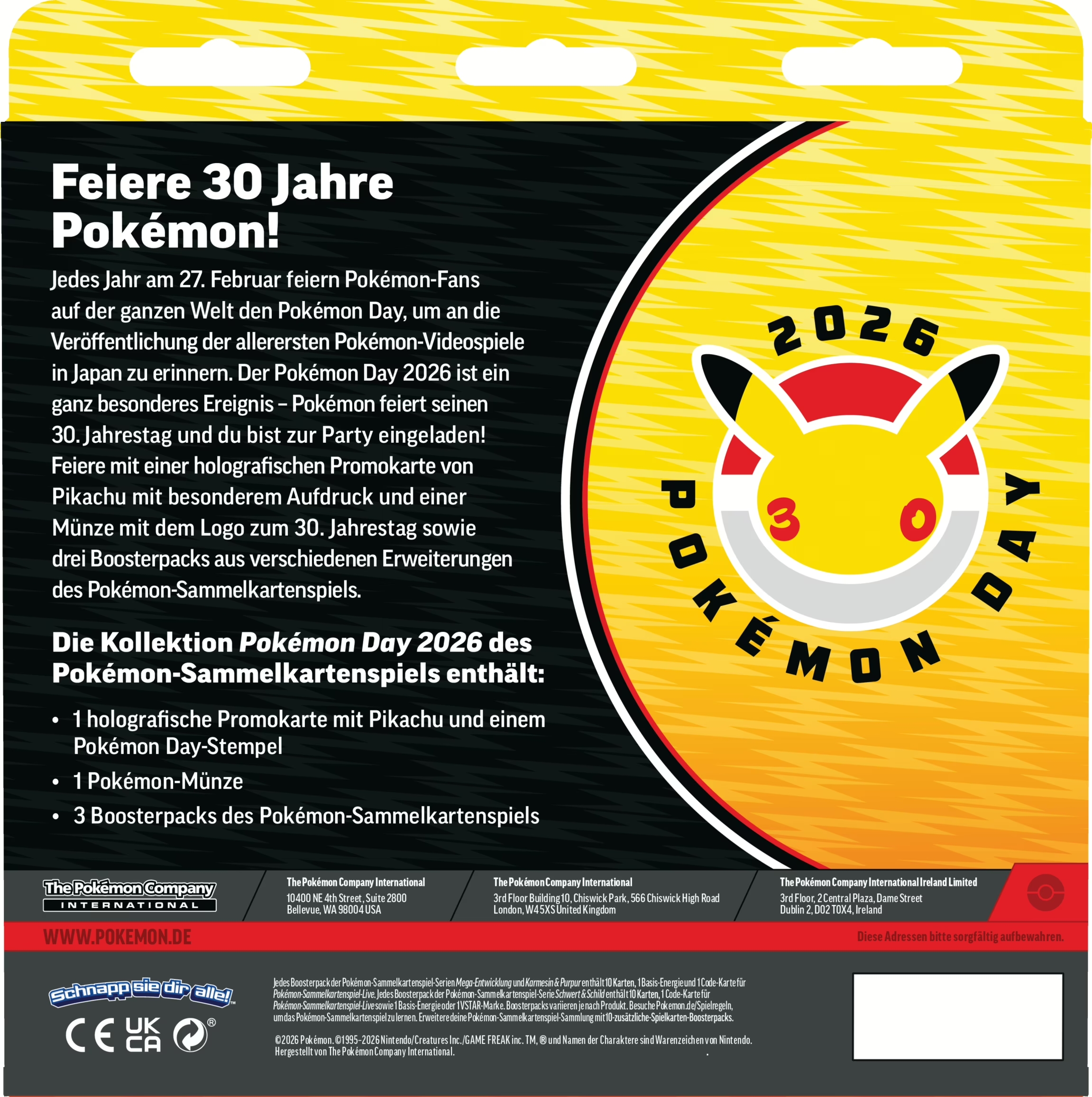 Jedes Jahr am 27. Februar feiern Pokémon-Fans auf der ganzen Welt den Pokémon Day, um an die Veröffentlichung der allerersten Pokémon-Videospiele in Japan zu erinnern. Der Pokémon Day 2026 ist ein ganz besonderes Ereignis - Pokémon feiert seinen 30. Jahrestag und du bist zur Party eingeladen!