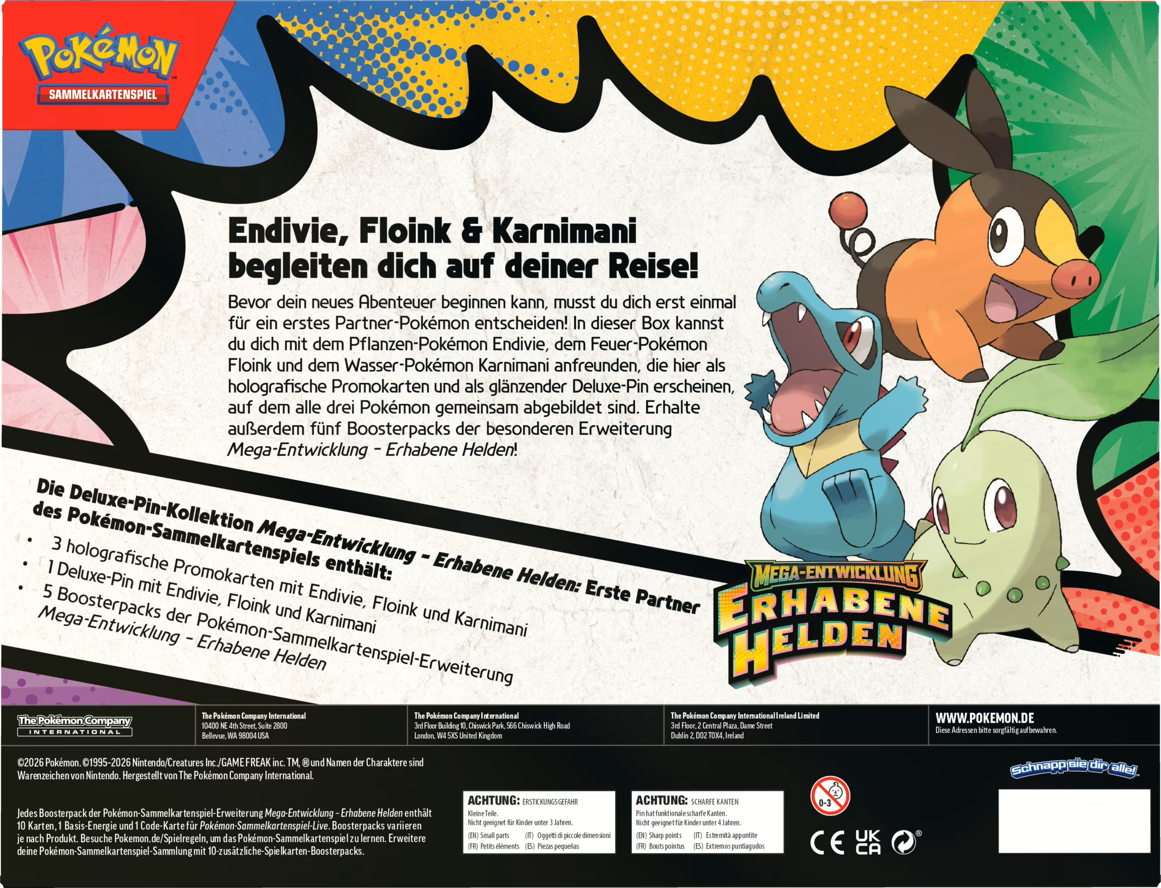 Bevor dein erstes Abenteuer beginnen kann, musst du dich erst einmal für dein erstes Partner-Pokémon entscheiden! In dieser Box kannst du dich mit dem Pflanzen-Pokémon Endivie, dem Feuer-Pokémon Floink und dem Wasser-Pokémon Karnimani anfreunden, die hier als holografische Promokarten und als glänzender Deluxe-Pin erscheinen, auf dem alle drei Pokémon gemeinsam abgebildet sind. Erhalte außerdem fünf Boosterpacks der besonderen Erweiterung Mega-Entwicklung - Erhabene Helden!